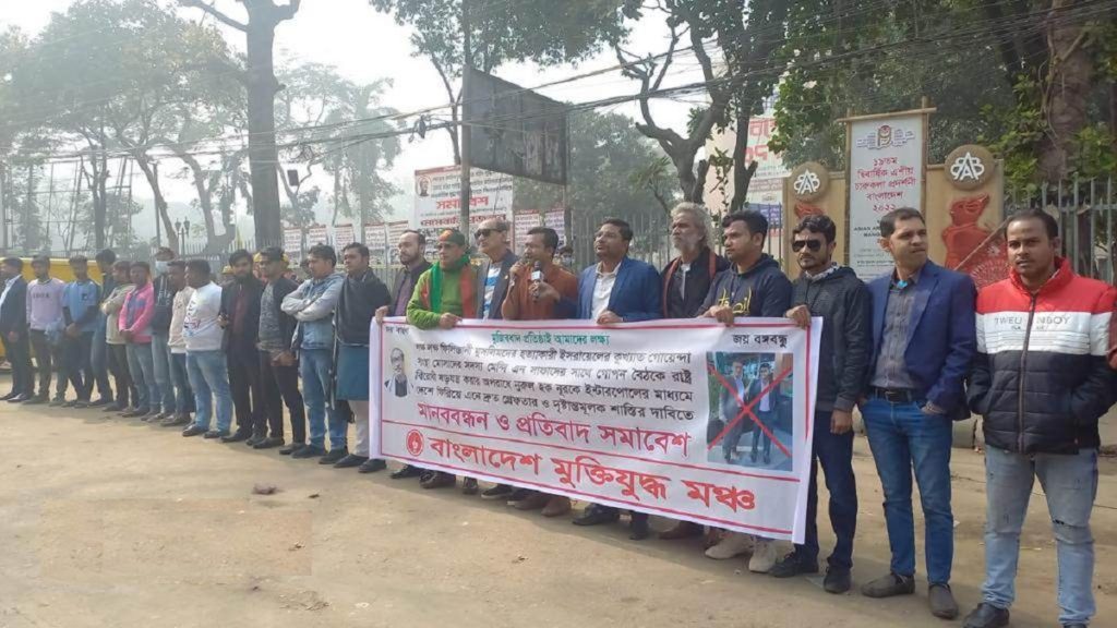 রোববার (৮ জানুয়ারি) দুপুরে জাতীয় জাদুঘরের সামনে মানববন্ধন ও প্রতিবাদ সমাবেশ কর্মসূচি পালন করে বাংলাদেশ মুক্তিযুদ্ধ মঞ্চ।