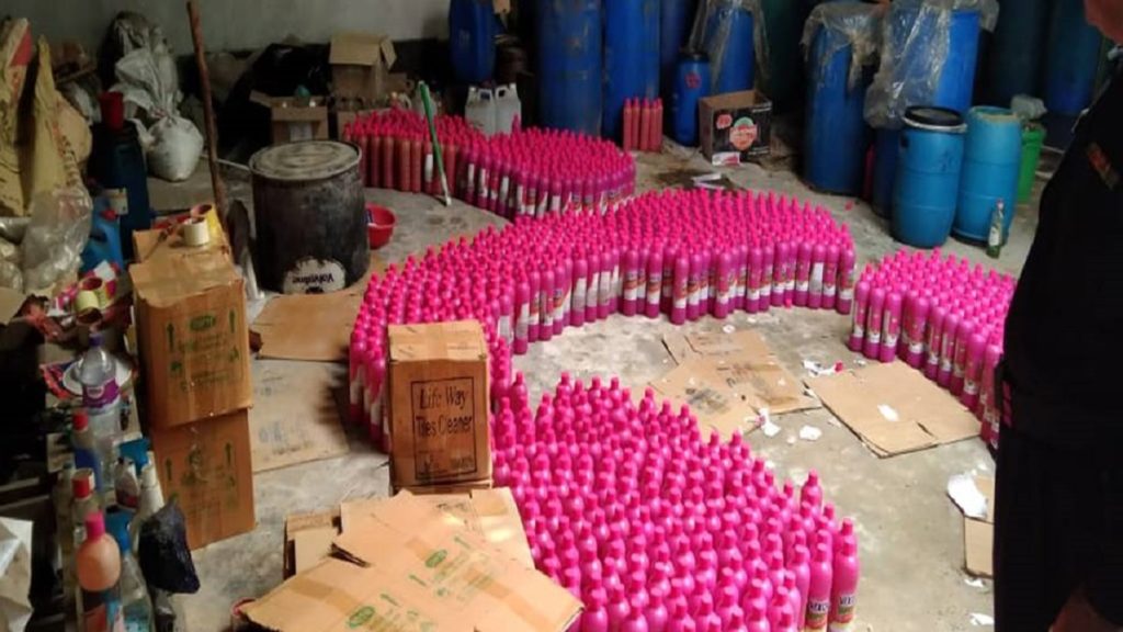 ঝিনাইদহ শহরে দু’টি বাড়িতে অবৈধভাবে ফ্যাক্টরি বানিয়ে নকল ভিক্সল-হ্যান্ডওয়াশ, কেমিক্যাল ও মোড়ক তৈরির অপরাধে ২ ব্যক্তিকে আড়াই লাখ টাকা জরিমানা প্রদান করেছে ভ্রাম্যমাণ আদালত। জরিমানার টাকা দিতে অপরাগতা প্রকাশ করায় একজনকে জেল-হাজতে প্রেরণ করা হয়।