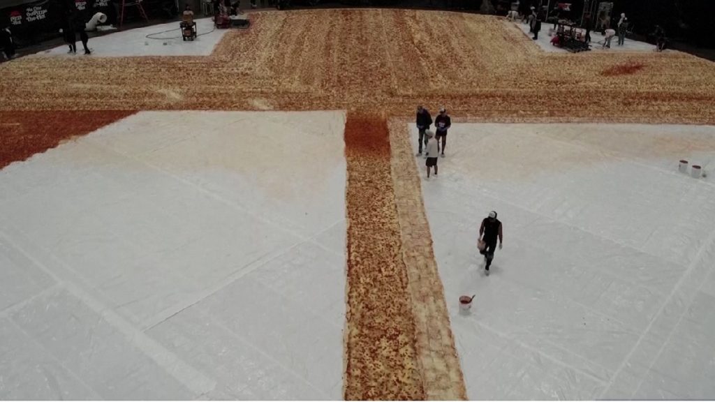 দৈত্যকার এ পিৎজা বানিয়ে রেকর্ড গড়বেন গিনিস বুকে। তাই চলছে ডজন খানেক মানুষের তোরজোর। ফ্লোরে আটা, ময়দা, পনির ও সসের সংমিশ্রণে তৈরি হচ্ছে ১৪০০ স্কয়ার ফিটের পিৎজা। প্রায় ৪৮ ঘণ্টা সময়ের ব্যবধানে তৈরি হবে এই আকর্ষনীয় গোলাকার পিৎজা। যা হবে বিশ্বের সব থেকে বড়।