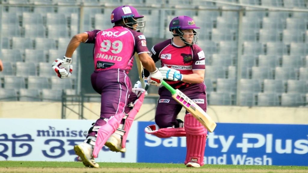 কিন্তু ৪র্থ উইকেটে টম মোরেসকে সঙ্গী করে ৮১ রানের আগ্রাসী জুটি গড়েন শান্ত। ৪টি চার ও ১টি ছক্কার সাহায্যে ৩০ বলে ৪০ রান করে সাকিবের বলে স্ট্যাম্পিংয়ের ফাঁদে পড়েন মোরেস। তবে, অন্যপ্রান্তে থেমে থাকেননি শান্ত। বাউন্ডারির ফুলঝুরি ছড়িয়ে ৬৬ বলে ৮৯ রানের এক ইনিংস খেলে অপরাজিত থাকেন শান্ত। অপরদিকে, থিসারা পেরেরা ১৬ বলে ২১ রান করেন। শেষ পর্যন্ত ৫ উইকেট হারিয়ে ১৭৩ রানে থামে সিলেটের ইনিংস।