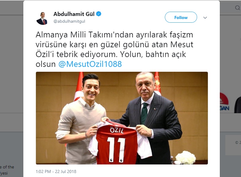 টুইটে সেই আলোচিত ছবিটি ব্যবহার করেছে গুল যেটির কারণে জার্মানিতে সমালোচনার মুখে পড়তে হয় বর্ণবাদীদের কাছ থেকে। গত মে মাসে তোলা ছবিতে দেখা যাচ্ছে জার্সি হাতে এরদোগানের সাথে হাসিমুখে ছবি তুলছেন জার্মান ফরওয়ার্ড।