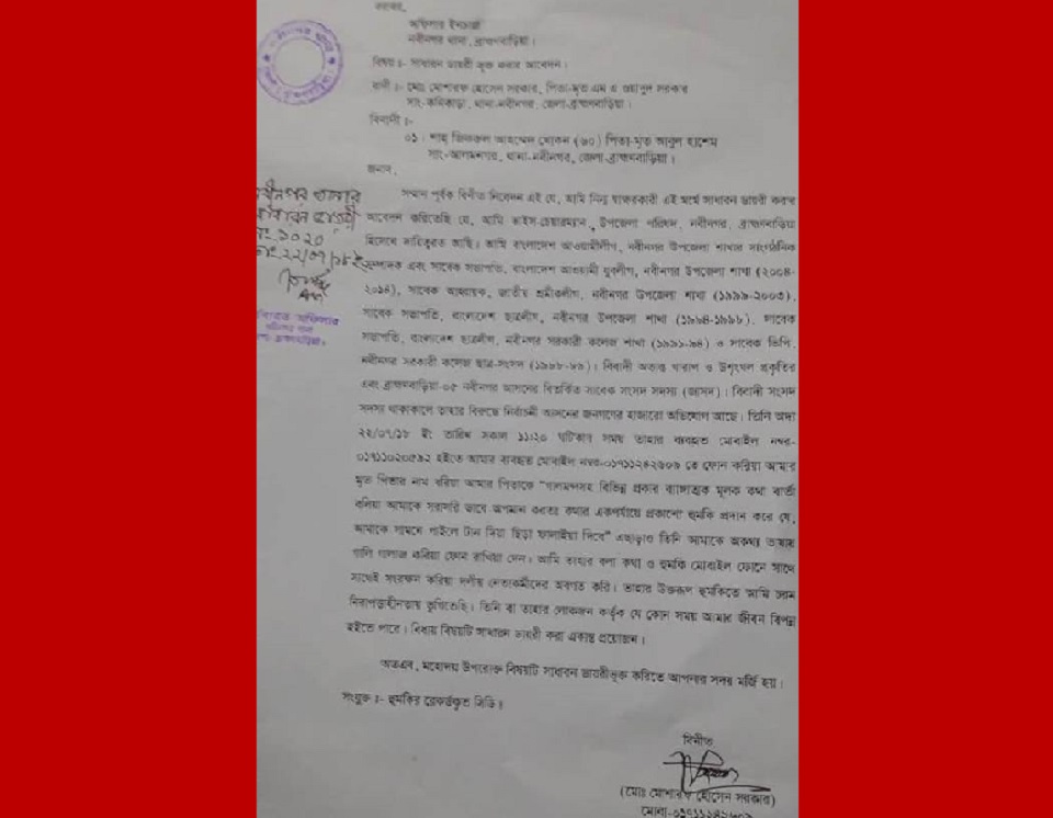 মোশারফ হোসেন সরকার সাধারণ ডায়েরিতে উল্লেখ করেন, নবীনগরে সাবেক সংসদ সদস্য ও বাংলাদেশ সমাজতান্ত্রিক দল-জাসদের স্থায়ী কমিটি সদস্য অ্যাডভোকেট শাহ জিকরুল আহমেদ খোকন তার ব্যবহৃত মোবাইল থেকে নবীনগর উপজেলা পরিষদের ভাইস চেয়ারম্যান ও উপজেলা আওয়ামী লীগের সাংগঠনিক মোশারফ হোসেনের মোবাইলে রোববার (২২ জুলাই) সকাল ১১.২০ মিনিটে কল দিয়ে অকথ্য ভাষায় গালাগাল করেন। এসময় তাকে সামনে পেলে টান দিয়ে ছিড়ে ফেলে দেবে বলে হুমকি দেন।