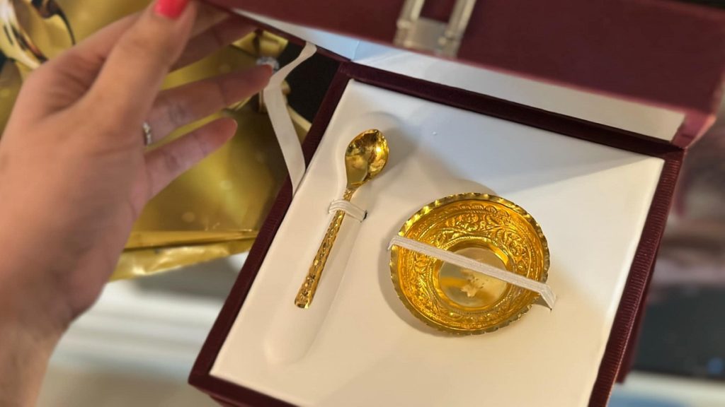 সন্তানের মুখে ভাত অনুষ্ঠানের আয়োজন করতে যাচ্ছেন রাজ-পরী। সেজন্য আনা হয়েছে স্বর্ণের চামচ এবং বাটি। আর সামাজিক যোগাযোগমাধ্যমে সেই ছবি শেয়ার করে পরীমণি বললেন, কেউ আদিখ্যেতা মনে করলে তার ভালোই লাগবে।
