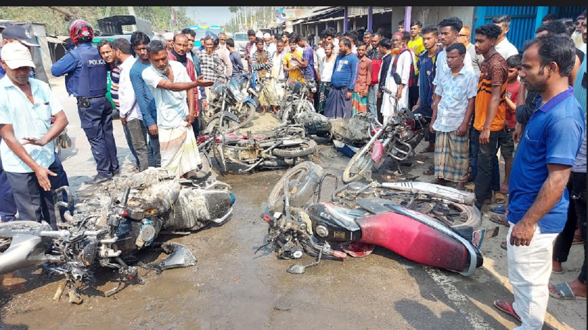 পরে পুলিশ এসে পরিস্থিতির নিয়ন্ত্রণে আনে। এ সময় সড়কের ওপর থাকা ১৩ টি মোটরসাইকেলে অগ্নিসংযোগ করা হয়।