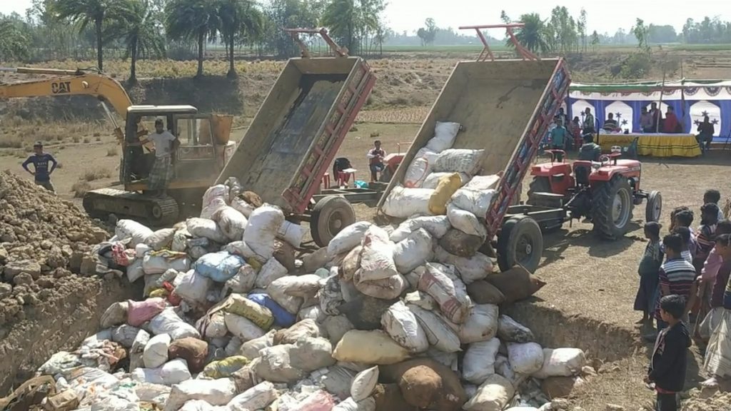 সোমবার (১৩ ফেব্রুয়ারি) দুপুরে পৌরসভার জালালপুর শ্মশান ঘাটের পাশে একটি খালি জায়গায় গর্ত করে তাতে এসব পণ্য পুড়িয়ে ধ্বংস করা হয়।