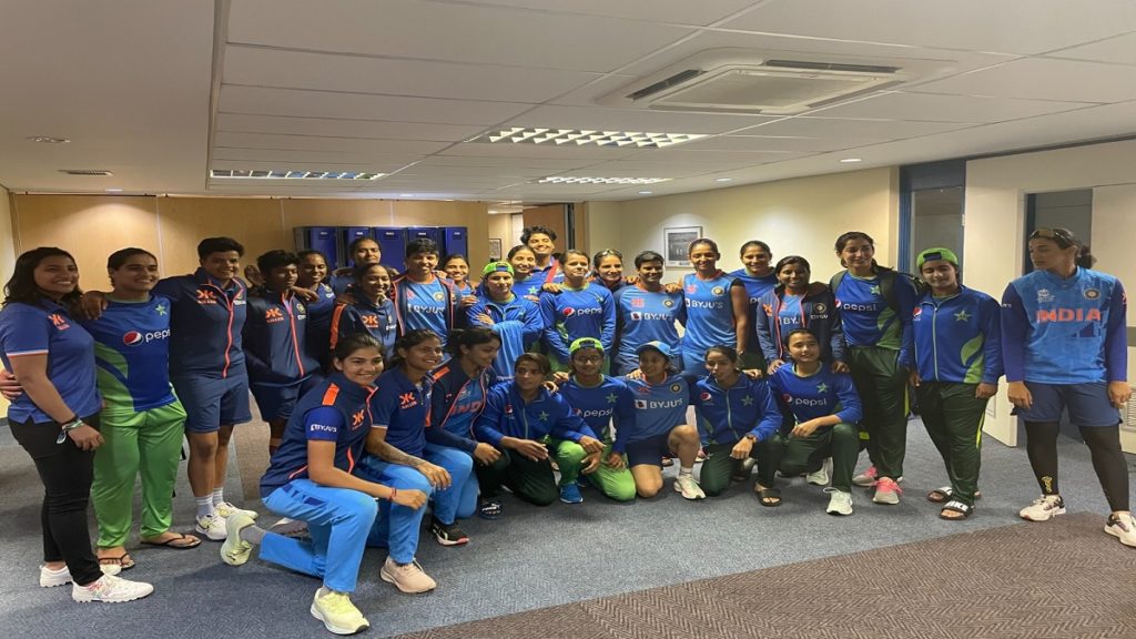 নারী টি-টোয়েন্টি বিশ্বকাপে ভারতের কাছে ৭ উইকেটে হেরেছে পাকিস্তান। হার নিয়ে মন খারাপের প্রহর পার করছিলো বিসমাহ মারুফরা। এ সময়ই ভারতীয় নারী ক্রিকেটাররা এগিয়ে আসেন, মিলেমিশে একাকার হয়ে যান পাকিস্তান দলের সাথে। এ সময়, দুই দলের মধ্যেই হয়েছে শুভেচ্ছা বিনিময়, হয়েছে জার্সি বিনিময়। শেষে দলবদ্ধ হয়ে ছবিও তুলেছেন তারা।