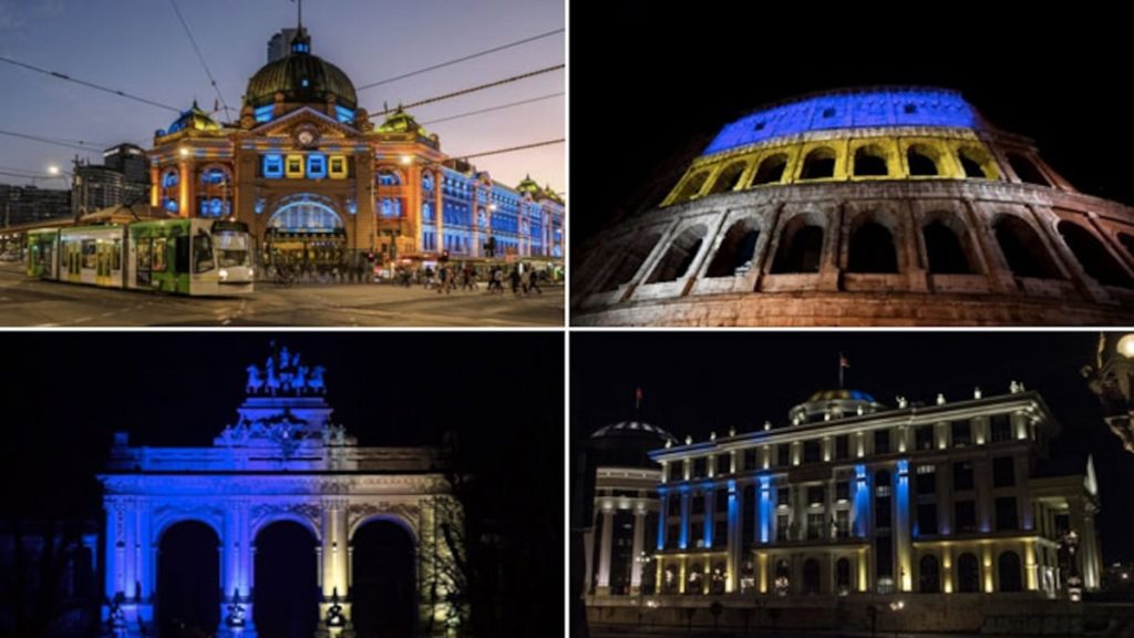 রুশ-ইউক্রেন যুদ্ধের এক বছর পূর্ণ হলো। এ যুদ্ধে ইউক্রেনের প্রতি সংহতি প্রকাশ করে বিশ্বের নানা স্থাপনায় জ্বালানো হয়েছে দেশটির জাতীয় পতাকার রঙের আলো। খবর ইউরো নিউজের।