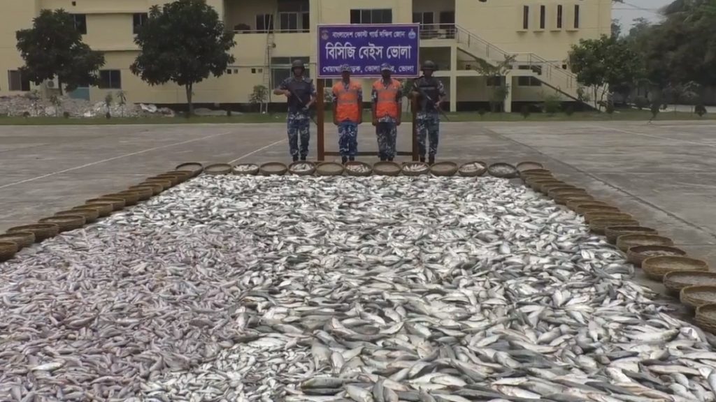 কোস্টগার্ড দক্ষিণ জোনের স্টাফ অফিসার অপারেশন লে. এম হাসান মেহেদী জানান, গোপন সংবাদের ভিত্তিতে রাজাপুর এলাকায় মেঘনা নদীতে কোস্টগার্ডের একটি টিম বিশেষ অভিযান পরিচালনা করে। এতে ২টি ট্রলার তল্লাশি করে ১০৩ মন ইলিশ, ২৩ মন চিংড়ি ও ১২ মন পোয়া মাছ জব্দ করা হয়। এ সময় কোস্টগার্ডের উপস্থিতি টের পেয়ে জড়িতরা পালিয়ে যাওয়ায় তাদের আটক করা সম্ভব হয়নি। জব্দকৃত মাছগুলো স্থানীয় এতিমখানায় বিতরণ করা হয় বলেও জানান তিনি।