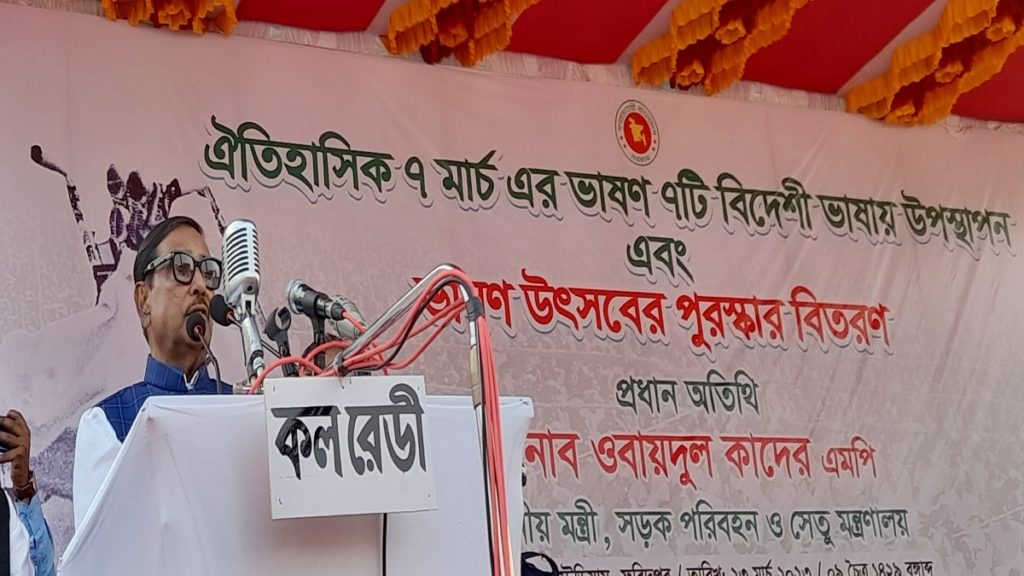 বৃহস্পতিবার (২৩ মার্চ) বিকেলে ফরিদপুরের শেখ জামাল স্টেডিয়ামে ঐতিহাসিক ৭ মার্চের ভাষণ ৭টি বিদেশি ভাষায় উপস্থাপন ও ভাষণ উৎসবের পুরস্কার বিতরণ অনুষ্ঠানে প্রধান অতিথির বক্তব্যে তিনি এসব কথা বলেন।