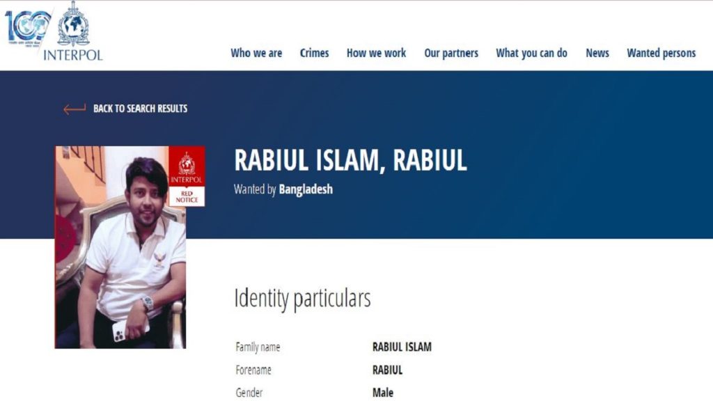 ইন্টারপোলের ওয়বসাইটে প্রকাশিত রেড নোটিশে তার নাম লেখা হয়েছে রবিউল ইসলাম। বয়স ৩৫ বছর। জাতীয়তা দেখানো হয়েছে বাংলাদেশি। আর জন্মস্থান বাগেরহাট। খুনের দায়ে তার বিরুদ্ধে এই নোটিশ বলে জানানো হয়।