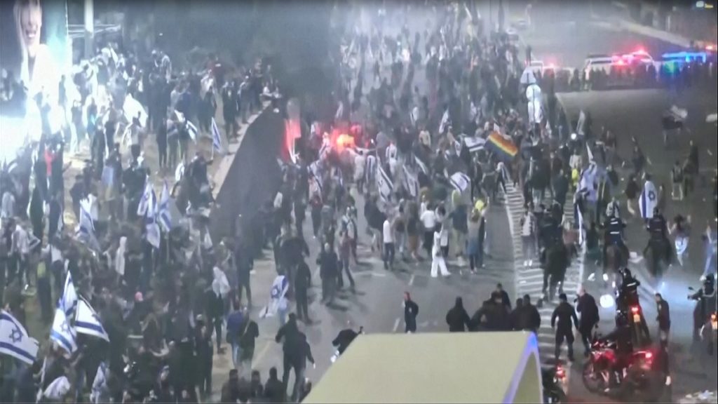 সোমবার (২৭ মার্চ) ভোরে জেরুজালেমে ভেঙে ফেলা হয় প্রধানমন্ত্রীর বাসভবনের নিরাপত্তা বেষ্টনী। সরকার পতনের স্লোগান দিয়ে ভেতরে ঢুকে পড়েন ক্ষুব্ধ ইসরায়েলিরা। জনস্রোত মোকাবেলায় বাধ্য হয়েই পুলিশ ব্যবহার করে জলকামান। চালায় ধরপাকড়।