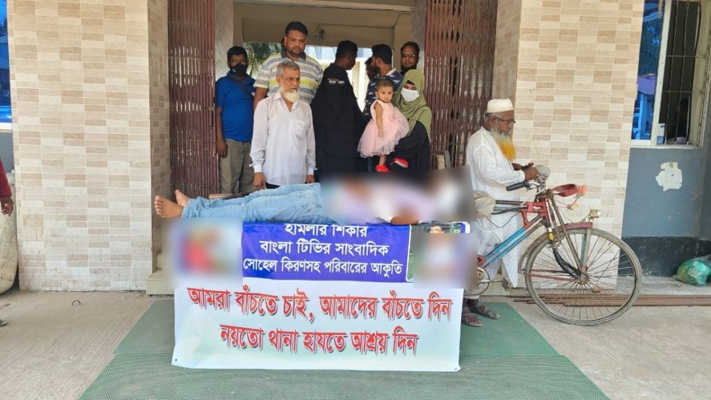 ‘বাঁচতে চাই বাঁচতে দিন, নয়তো থানায় আশ্রয় দিন’ এমন ব্যানার নিয়ে ভ্যান গাড়িতে চড়ে হাসপাতাল থেকে রূপগঞ্জ থানায় গিয়ে আশ্রয় নিয়েছেন রূপগঞ্জের বাংলা টিভির সাংবাদিক সোহেল কিরন ও তার পরিবারের সদস্যরা।