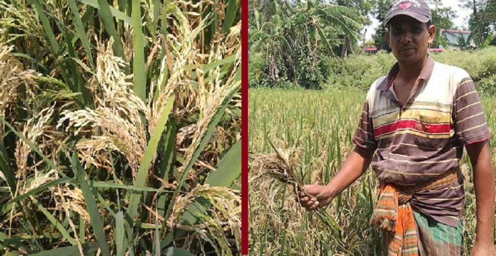 একই ইউনিয়নের মেগুরুখিদ্দা গ্রামের কৃষক ইমদাদ হোসেন জানান, আমার জমির পাশে তপন কুমার মন্ডল নামে এক কৃষক ৮ শতক জমিতে ২৮ ধান করেছিল। গত কয়েকদিনে জমির সব ধান লাল রং হয়ে নষ্ট হয়ে গেছে।