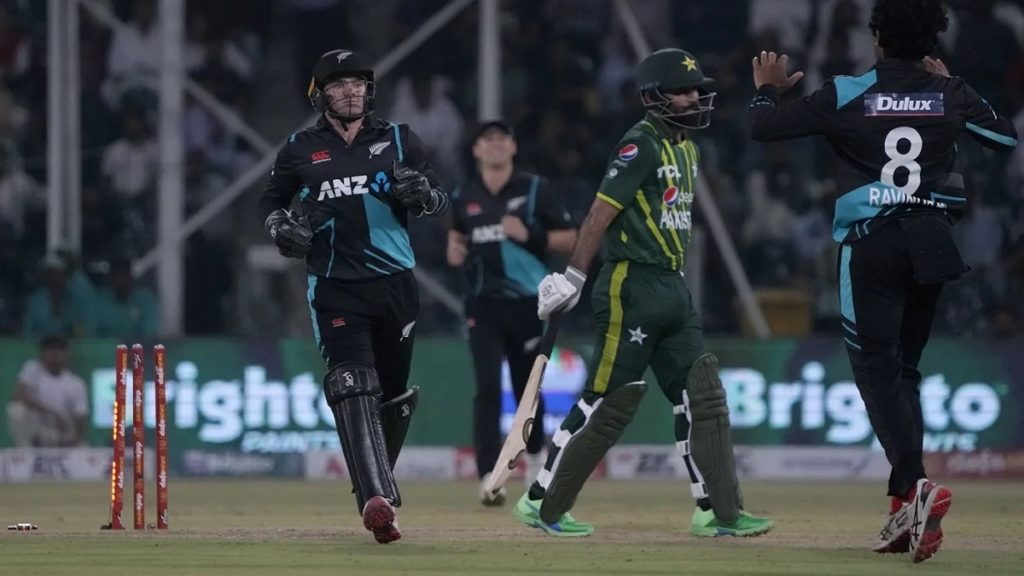 লাহোরের গাদ্দাফি স্টেডিয়ামে টস জিতে আগে ব্যাটিংয়ে নামে নিউজিল্যান্ড। অধিনায়ক টম ল্যাথাম ছাড়া আর কেউই সেভাবে বড় রান করতে পারেননি। যার ফলে ৫ উইকেটে ১৬৩ রানের পুঁজি পায় সফরকারীরা। ৪৯ বলে ৭ চার ও ২ ছক্কায় ৬৪ রান করেন ল্যাথাম। পাকিস্তানের হয়ে দুটি উইকেট নেন শাহীন আফ্রিদি ও হারিস রউফ।