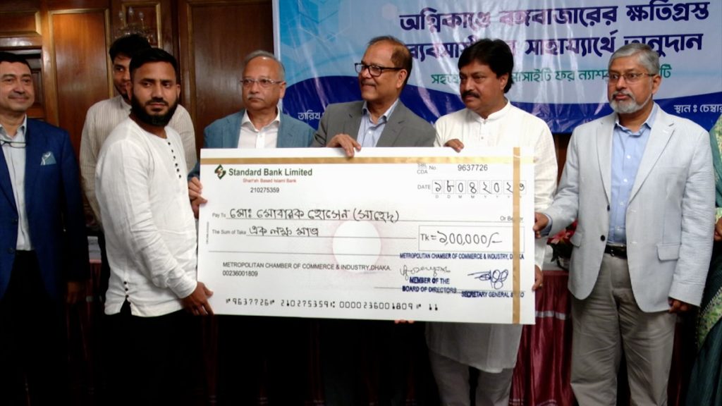 রাজধানীর বঙ্গবাজারে ক্ষতিগ্রস্ত ১৪২ জন ব্যবসায়ীকে ১ লাখ টাকা করে মোট ১ কোটি ৪২ লাখ টাকা অনুদান দিয়েছে মেট্রোপলিটন চেম্বার অব কমার্স অ্যান্ড ইন্ডাস্ট্রি (এমসিসিআই)।