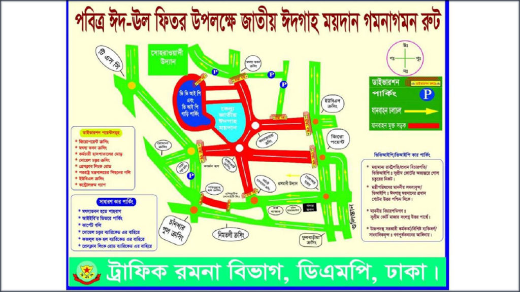 পবিত্র ঈদ-উল-ফিতর উপলক্ষে জাতীয় ঈদগাহ ময়দানে গমনাগমন বিষয়ে ঢাকা মেট্রোপলিটন পুলিশের (ডিএমপি) ট্রাফিক রমনা বিভাগের পক্ষ থেকে কিছু ট্রাফিক নির্দেশনা দেয়া হয়েছে। শুক্রবার (২১ এপ্রিল) মিডিয়া অ্যান্ড পাবলিক রিলেশনস বিভাগের পক্ষ থেকে এ তথ্য জানানো হয়েছে।