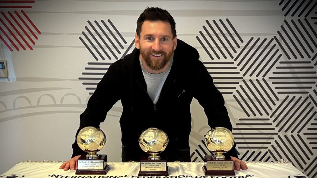 একসাথে তিন ট্রফি হাতে পেয়েছেন লিওনেল মেসি। ২০২২ সালের আইএফএফএইচএস বিশ্বের সেরা খেলোয়াড়, সেরা প্লেমেকার ও আন্তর্জাতিক ফুটবলে সেরা গোলদাতার পুরস্কার জিতেছিলেন এই আর্জেন্টাইন ফুটবল জাদুকর।