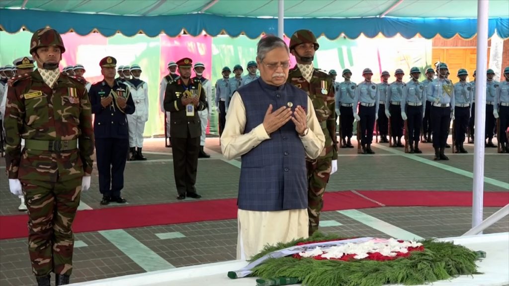 এর আগে, রাষ্ট্রপতি শিখা অনির্বাণে পৌঁছালে সেনাপ্রধান জেনারেল এস এম শফিউদ্দিন আহমেদ, নৌবাহিনী প্রধান অ্যাডমিরাল এম শাহীন ইকবাল এবং বিমান বাহিনী প্রধান এয়ার চিফ মার্শাল শেখ আবদুল হান্নান তাকে স্বাগত জানান।