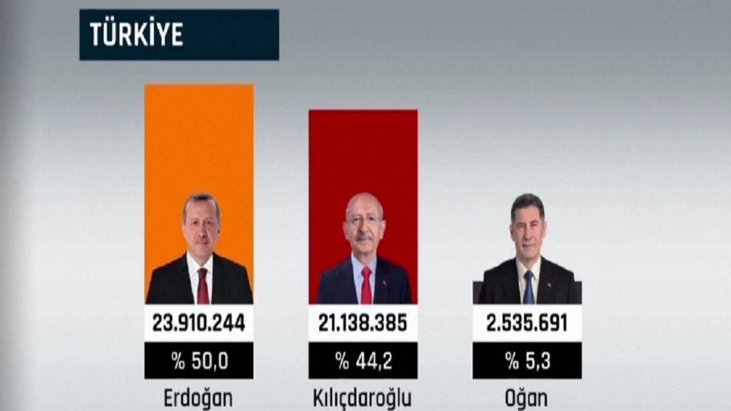 দেশটির নির্বাচন কমিশন জানায়, নির্বাচনে হাড্ডাহাড্ডি লড়াই হয়েছে। কিন্তু প্রধান প্রতিদ্বন্দ্বী রিসেপ তাইয়েপ এরদোগান বা কিরিচ দারোগলু’র কেউই ৫০ শতাংশ ভোট নিশ্চিত করতে পারেননি। প্রেসিডেন্ট পেয়েছেন ৪৯ দশমিক পাঁচ শতাংশ ভোট।