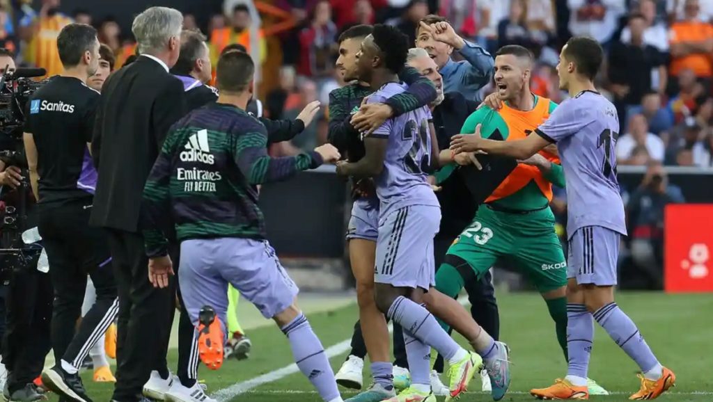ভ্যালেন্সিয়ার দর্শক গ্যালারি থেকে ভিনিসিয়াসের দিকে ছুঁড়ে দেয়া হয়েছে বর্ণবাদী মন্তব্য। জবাবে ভিনিসিয়াস সেই দর্শকদের দিকে এগিয়ে গিয়ে বলতে থাকেন, ভ্যালেন্সিয়া সেকেন্ড ডিভিশনে নেমে যাবে। এ সময় প্রায় ১০ মিনিট খেলা বন্ধ থাকে। ভ্যালেন্সিয়ার এক খেলোয়াড়ের সাথে বিবাদে জড়িয়ে অতিরিক্ত সময়ে লাল কার্ডও দেখেছেন এই ব্রাজিলিয়ান উইঙ্গার।