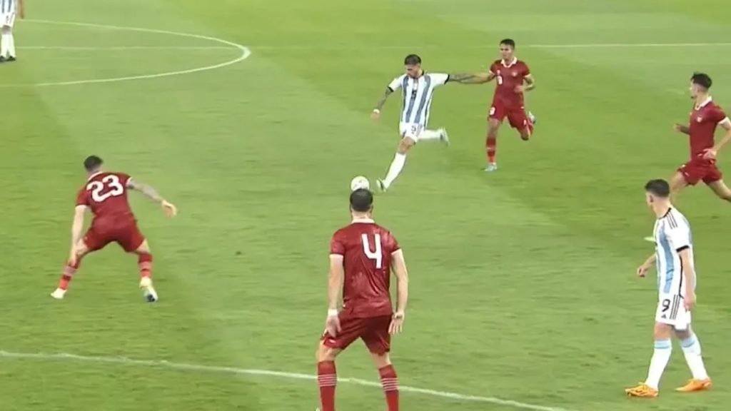 নিজেদের ঘরের মাঠ গোলারো বুং কার্নো স্টেডিয়ামে বিশ্ব চ্যাম্পিয়ন আর্জেন্টিনাকে আতিথ্য জানায় ইন্দোনেশিয়া। ম্যাচের শুরু থেকেই আক্রমণে একক আধিপত্য বিস্তার করে আলবিসেলেস্তেরা। মুহুর্মুহু আক্রমণ শানালেও কাঙ্ক্ষিত গোলের দেখা পাচ্ছিলেন না নিকয় গঞ্জালেস, হুলিয়ান আলভারেজরা।