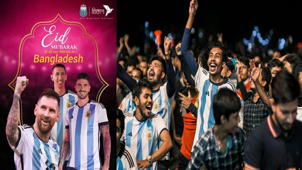 ম্যারাডোনার সময় থেকেই বাংলাদেশের মানুষের হৃদয়ে জায়গা করে নিয়েছে আলবিসেলেস্তারা। তবে দুই দেশের সম্পর্কটা চরমে পৌঁছায় কাতার বিশ্বকাপে। বাংলাদেশ থেকে কোটি কোটি মানুষের এমন সমর্থন পেয়ে বেশ অবাক হয়েছিলো আর্জেন্টাইনরা। তখন থেকেই বাংলাদেশকে ফিরতি ভালোবাসা দিতে ভুল করেনি আকাশী-নীল দেশের মানুষরা। ভালোবাসার প্রতিদানে বাংলাদেশ ক্রিকেট দলকে সমর্থন দিতেও দেখা গেছে আর্জেন্টাইনদের। এবার বাংলাদেশের অন্যতম বড় ধর্মীয় উৎসব ঈদ-উল-আজহার দিনেও শুভেচ্ছা জানিয়েছে আর্জেন্টিনা।