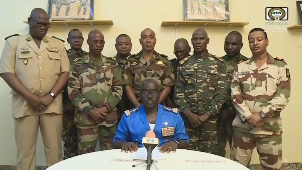 আফ্রিকার দেশ নাইজারে রক্তপাতহীন অভ্যুত্থানের মাধ্যমে ক্ষমতায় বসলো সেনাবাহিনী। সৈন্যরা প্রেসিডেন্ট মোহামেদ বাজুমকে আটক করেছে, দেশব্যাপী কারফিউ জারি করেছে, সংবিধান বাতিল করেছে এবং সকল প্রতিষ্ঠান ও সীমান্ত বন্ধ করে দিয়েছে। বিবিসির খবর।