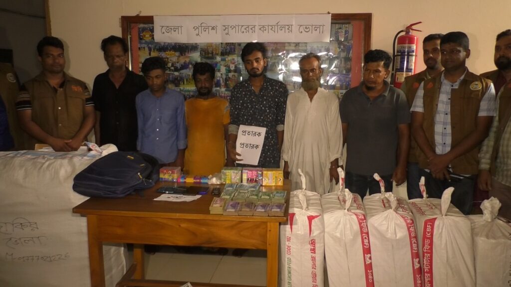 ভোলায় নগদ ১০ লাখ ১ হাজার ৪০০ টাকা ও বিপুল পরিমাণ অবৈধ মালামালসহ ৬ প্রতারককে আটক করেছে সাইবার ক্রাইম ইউনিট ভোলা শাখা। আটককৃতরা হলেন, জাকির হোসেন, মেহেদী হাসান, পারভেজ, শাহজাহান মোল্লা, ইউনুস শেখ ও ওবাইদুর রহমান। আটককৃতদের বাড়ি নোয়াখালী, গোপালগঞ্জ ও ফেনি জেলায় বলে জানা গেছে।