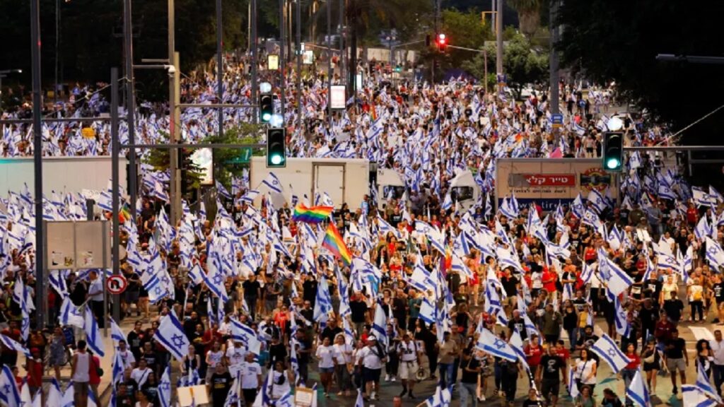 নেতানিয়াহু প্রশাসনের সংস্কার বিলের বিরুদ্ধে এ নিয়ে টানা ৩০তম সপ্তাহে গড়ালো বিক্ষোভ। এ দিন দেশটির রাজধানীর কাপলান স্কয়ারকে ঘিরে জড়ো হয় হাজার হাজার মানুষ। বিচারবিভাগের ক্ষমতা কমানোর তীব্র প্রতিবাদ জানায় আন্দোলনকারীরা। বিক্ষোভ ছড়ায় তেল আবিবের বাইরেও।