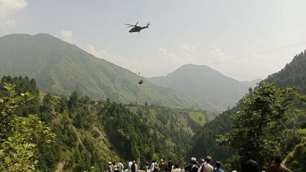 এর আগে একটি ভিডিওচিত্রে দেখা যায়, হেলিকপ্টার থেকে ছিঁড়ে যাওয়া ক্যাবল কারে নামছেন একজন বিশেষ প্রশিক্ষণপ্রাপ্ত অফিসার এবং পাহাড়ি এলাকার মানুষ ভিড় করে তা প্রত্যক্ষ করছিল। ক্যাবল কারে আটকে থাকা যাত্রী গুলফারাজ গণমাধ্যমকে জানান, বারবার অজ্ঞান হয়ে পড়ছে সেখানে থাকা ২ শিক্ষার্থী। আতঙ্ক ছড়িয়ে পড়ে স্থানীয়দের মাঝে।