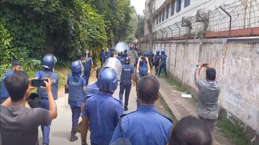পুলিশের দাবি, র্যালিটি শহরের কোট চত্বর এলাকায় আসলে সেখান থেকে হঠাৎ পুলিশকে লক্ষ্য করে বিএনপির নেতাকর্মীরা অতর্কিত হামলা করে। এতে তাদের ৩ পুলিশ সদস্য আহত হয়। পরবর্তীতে পরিস্থিতি নিয়ন্ত্রণে তারা ফাঁকা গুলি ও টিয়ারশেল নিক্ষেপ করেন।