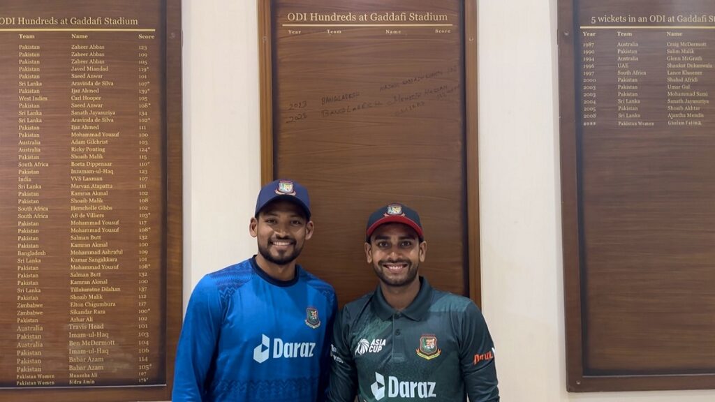 জোড়া সেঞ্চুরি করে লাহোরের গাদ্দাফি স্টেডিয়ামের অনার্স বোর্ডে নাম তুললেন মেহেদি হাসান মিরাজ ও নাজমুল শান্ত। সামাজিক যোগাযোগমাধ্যম ফেসবুকে পোস্ট দিয়ে বিষয়টি নিশ্চিত করেছে পিসিবি।