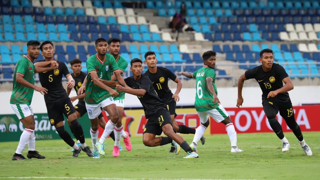থাইল্যান্ডের চনবুরিতে বাংলাদেশের ম্যাচের শুরুটা ভালোই হয়েছিল। বল পজিশন, আক্রমণে ভালোই পাল্লা দিচ্ছিল মালয়েশিয়ার সঙ্গে। যদিও প্রথমার্ধে সহজ সুযোগ নষ্ট করে মালয়েশিয়া। দ্বিতীয়ার্ধেও ৮২ মিনিট পর্যন্ত প্রতিপক্ষকে আটকে রেখেছিল বাংলাদেশ। তবে ৮৩ মিনিটে আলিফ ইজওয়ান বক্সের বাইরে থেকে দুর্দান্ত শটে গোল করেন, পিছিয়ে পড়ে বাংলাদেশ।