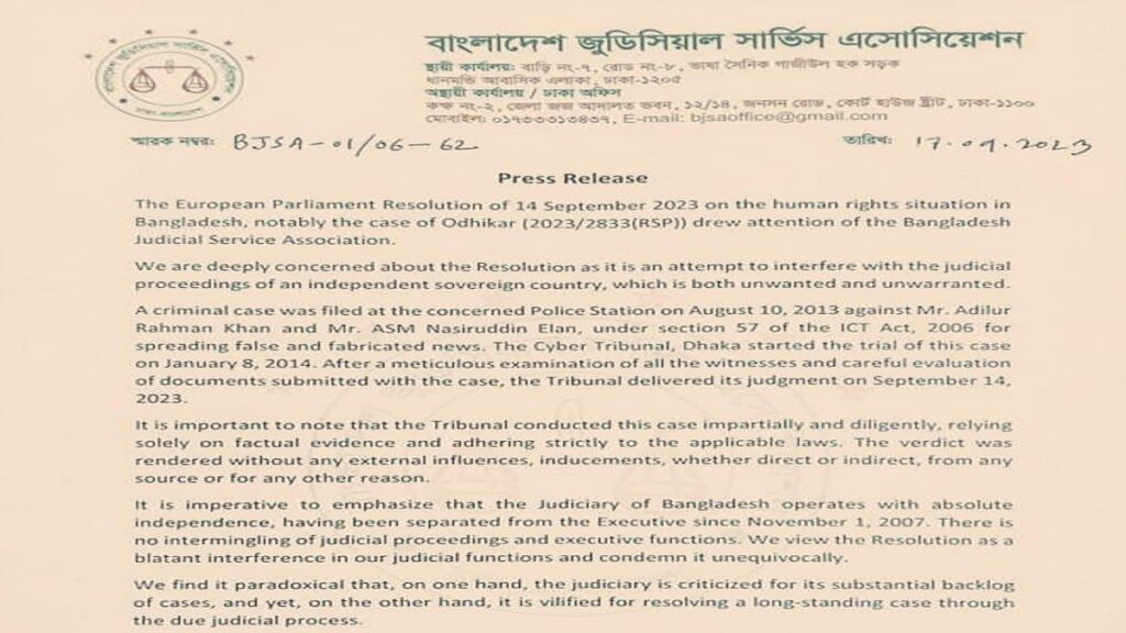 প্রেস বিজ্ঞপ্তিতে আরও বলা হয়েছে, মিথ্যা তথ্য ছড়ানোর অভিযোগে ২০১৩ সালে আদিলুর রহমান খান ও এএসএম নাসিরুদ্দিন এলানের বিরুদ্ধে আইসিটি অ্যাক্টের ৫৭ ধারায় মামলা দায়ের করা হয়। সাইবার ট্রাইব্যুনাল মামলাটি পক্ষপাতবিহীনভাবে পরিচালনা করেছে এবং ১৪ সেপ্টেম্বর এর চূড়ান্ত রায় দিয়েছে। অতএব আমরা ইউরোপীয় পার্লামেন্ট কর্তৃক এ ধরনের আকস্মিক নিন্দা প্রত্যাখ্যান করছি।