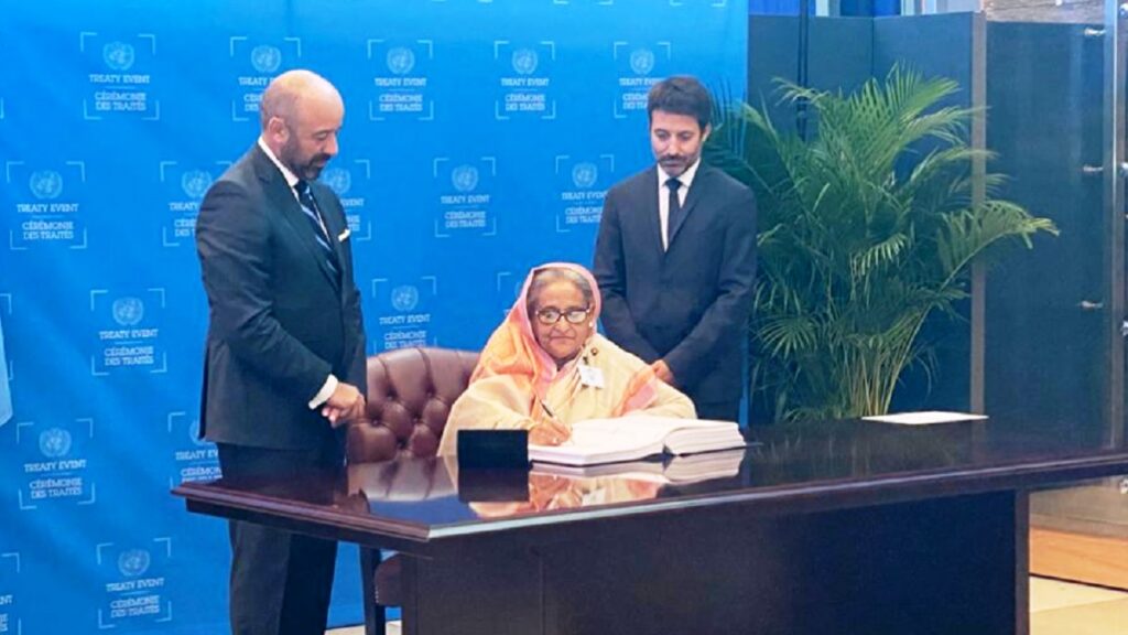 গভীর সমুদ্রে সম্পদ আহরণ ও সুষ্ঠু ব্যবহার সংক্রান্ত জাতিসংঘের একটি চুক্তিতে (ট্রিটি) সই করেছে বাংলাদেশ। বুধবার (২০ সেপ্টেম্বর) জাতিসংঘ সদর দফতরে বায়োলজিক্যাল ডাইভারসিটি অব এরিয়াস বিয়ন্ড ন্যাশনাল জুরিসডিকশন (বিবিএনজে) শীর্ষক এ সন্ধিপত্রে সই করেন প্রধানমন্ত্রী শেখ হাসিনা।