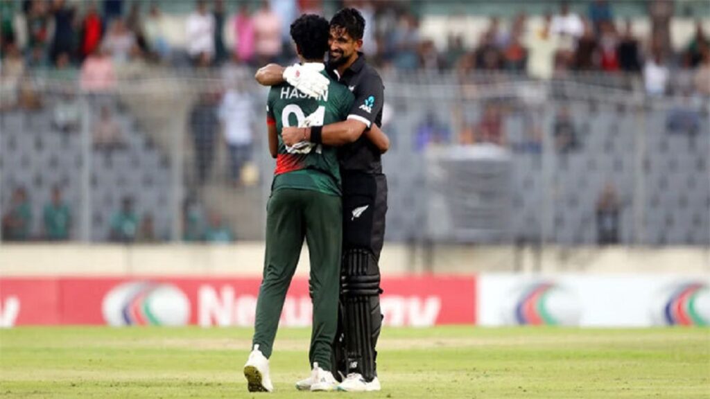 টাইগারদের এই ভদ্রতায় মুগ্ধ ক্রিকেট হন কিউই ব্যাটার ইশ সোধি। তিনি উইকেটে ফিরে নিজের হাত থেকে ব্যাট মাটিতে ফেলে দিয়ে হাতের গ্লাভস খুলে বোলার হাসান মাহমুদের সঙ্গে হাস্যোজ্জ্বল অবস্থায় কর্মোদন করেন। টাইগারদের এই ভদ্রতায় মুগ্ধ সমর্থকরা।