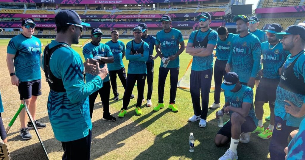 নানা জল্পনা-কল্পনার পর সাকিব আল হাসানের নেতৃত্বে বিশ্বকাপ খেলতে বুধবার (২৭ সেপ্টেম্বর) ভারতে পৌঁছেছে বাংলাদেশ দল। গতকাল পৌঁছানোর পর বাকিটা সময় টিম হোটেলে কাটিয়েছে টাইগাররা। আজ (বৃহস্পতিবার) অনুশীলন করেছে চান্দিকা হাথুরুসিংহের শিষ্যরা। গৌহাটিতে এদিন বেশ ফুরফুরে মেজাজেই দেখা গিয়েছে সাকিব আল হাসানের দলকে।