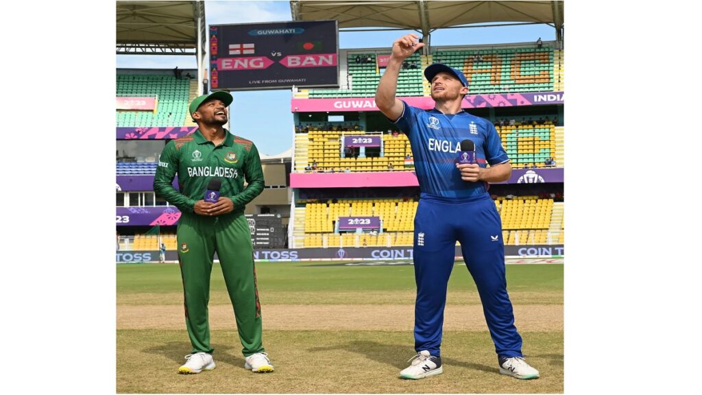 বিশ্বকাপের দ্বিতীয় প্রস্তুতি ম্যাচে ইংল্যান্ডের বিপক্ষে টসে জিতে ব্যাটিং করার সিদ্ধান্ত নিয়েছে বাংলাদেশ। ম্যাচটি ভারতের গোয়াহাটি বারসাপারা ক্রিকেট স্টেডিয়ামে দুপুর আড়াইটায় শুরু হবে। ম্যাচে অধিনায়কত্ব করবেন নাজমুল হোসেন শান্ত।