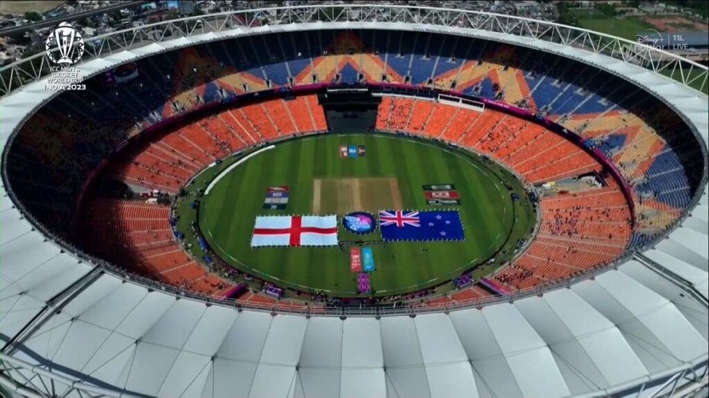 আহমেদাবাদের নরেন্দ্র মোদি স্টেডিয়াম। কয়েক বছর আগে যেটাকে সংস্কার করে আরও বেশি ধারণক্ষমতার বানানো হয়েছিল। আইসিসির হিসেব অনুযায়ী ১ লাখ ৩২ হাজার মানু্য একসঙ্গে স্টেডিয়ামে বসে ম্যাচ দেখতে পারবেন। বলা হয়, বিশ্বের সবচেয়ে বেশি আসনের স্টেডিয়াম এটা। স্বভাবতই, বিশ্বের সবচেয়ে বড় ক্রিকেট স্টেডিয়ামে বিশ্বকাপের উদ্বোধনী ম্যাচ আয়োজন করে তাক লাগিয়ে দিতে চেয়েছিল ভারত। প্রায় দেড় লাখ মানুষের চিৎকারে গমগম করবে স্টেডিয়াম, এমনটাই হয়তো আশা করেছিলেন আয়োজকেরা। কিন্তু তা আর হলো কোথায়!