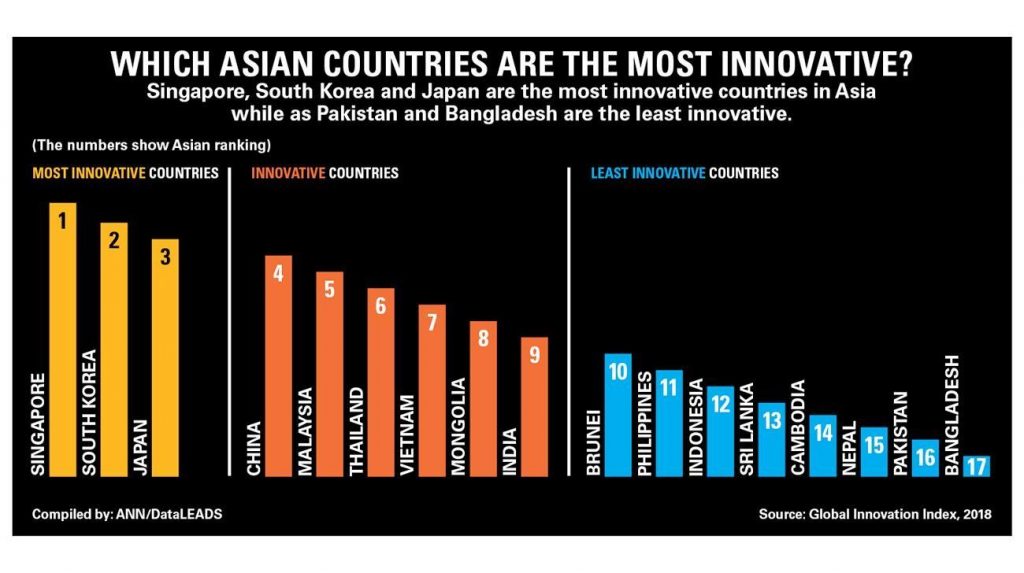 উদ্ভাবনী কাজে এশিয়া মহাদেশে সর্বনিম্ন অবস্থানে রয়েছে বাংলাদেশ। আর শীর্ষস্থান দখল করেছে সিঙ্গাপুর।