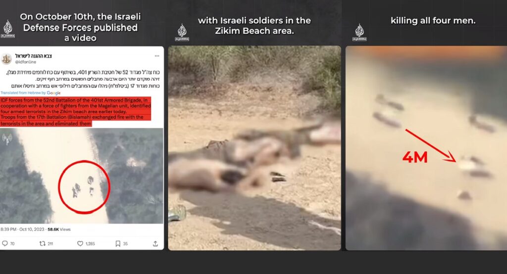 ইসরায়েলি ডিফেন্স ফোর্স (আইডিএফ) ১০ অক্টোবর একটি ভিডিও প্রকাশ করে। এতে দাবি করা হয়, ৪ সশস্ত্র ফিলিস্তিনি সন্ত্রাসীর সঙ্গে ইসরায়েলি সেনাদের গুলি বিনিময়ের ঘটনা ঘটে। ঘটনাস্থলেই ৪ ফিলিস্তিনি সন্ত্রাসী নিহত হন। আইডিএফ’র এই দাবির সত্যতা যাচাই করেছে আল জাজিরার ডিজিটাল ইনভেস্টিগেশন টিম ‘সানাদ’। স্যাটেলাইট ইমেজ এবং ক্রোনোলজিক্যাল অর্ডার ব্যবহার করে ‘সানাদ’র করা প্রতিবেদনে দেখানো হয়েছে, ইসরায়েলের জিকিম বিচ এলাকায় নিহত ওই চার ফিলিস্তিনি ছিলেন নিরস্ত্র। তারা হাত উঁচু করে আত্মসমর্পণও করেছিলেন। ইসরায়েলি সেনা সদস্যরা তাদের দিকে এগিয়ে আসে। মাত্র ৪ মিটার দূর থেকে ঠান্ডা মাথায় তাদের গুলি করে ইসরায়েলি সেনারা। এরপর লাশগুলো নিজেদের মতো করে সুবিধাজনকভাবে রাখে। পাশে রাখা হয় অস্ত্র। আইডিএফর এই ফুটেজ বেশ কয়েকটি পশ্চিমা গণমাধ্যম কোনো ধরনের যাচাই বাছাই ছাড়াই প্রচার করে। অথচ আল জাজিরার ইনভেস্টিগেশনে এটাকে ‘ওয়ার ক্রাইম’ হিসেবে বর্ণনা করা হয়েছে।