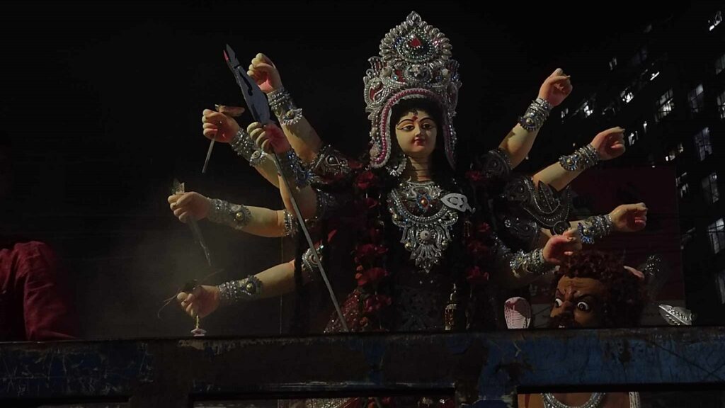 ঘাটে পৌঁছে ঢাকের বাদ্যের সাথে প্রতীমা তোলা হয় নৌকায়। দেবীর নাম জপতে জপতে মাঝ নদীতে গিয়ে মা দূর্গাকে দেয়া হয় বিসর্জন।