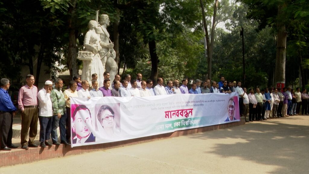 বিএনপি চেয়ারপারসন খালেদা জিয়া ও মহাসচিব মির্জা ফখরুল ইসলাম আলমগীরসহ দলটির সকল নেতাকর্মীর মুক্তি এবং নির্দলীয় সরকারের অধীনে নির্বাচনের দাবিতে মানববন্ধন করেছেন ঢাকা বিশ্ববিদ্যালয়ের বিএনপিপন্থী সাদা দলের শিক্ষক নেতারা।