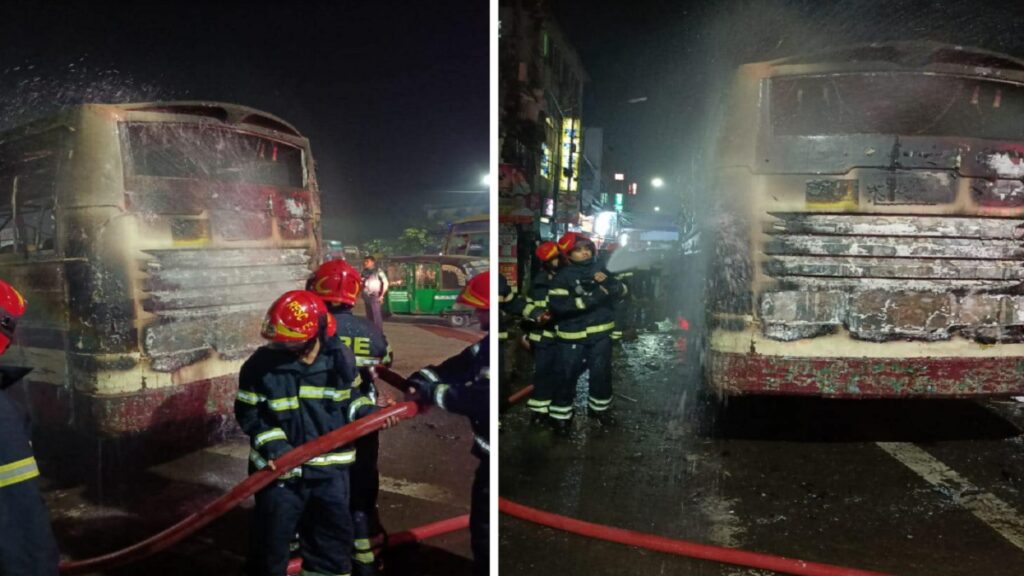 শনিবার রাত ৮টা ২০ মিনিটে নটরডেম কলেজের সামনে একটি যাত্রীবাহী বাসে আগুন দেয় দুর্বৃত্তরা। খবর পেয়ে ঘটনাস্থলে পৌঁছায় সিদ্দিক বাজার ফায়ার স্টেশনের দুটি ইউনিট। পরে ফায়ার সার্ভিস কর্মীদের চেষ্টায় আগুন নিয়ন্ত্রণে আসে।