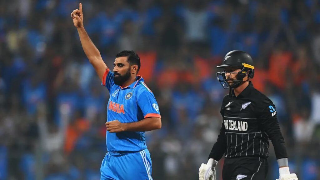 বিশ্বকাপের প্রথম সেমিফাইনালে নিউজিল্যান্ডের বিপক্ষে আগে ব্যাট করতে নেমে ভিরাট কোহলি ও শ্রেয়াস আইয়ারের জোড়া সেঞ্চুরি এবং শুভমান গিলের হাফ সেঞ্চুরিতে ৩৯৭ রানের পাহাড় গড়েছে ভারত। লক্ষ্য তাড়া করতে নেমে ভারতীয় পেসার মোহাম্মদ শামির বোলিং তোপে মাত্র ৩৯ রান তুলতেই ডেভন কনওয়ে ও ইনফর্ম ব্যাটার রাচিন রবীন্দ্র’র উইকেট হারিয়ে দিশেহারা কিউইরা। এই দুই ওপেনারকে সাজঘরে ফেরান শামি। পাওয়ারপ্লে শেষে নিউজিল্যান্ডের সংগ্রহ ২ উইকেট হারিয়ে ৪৬ রান।