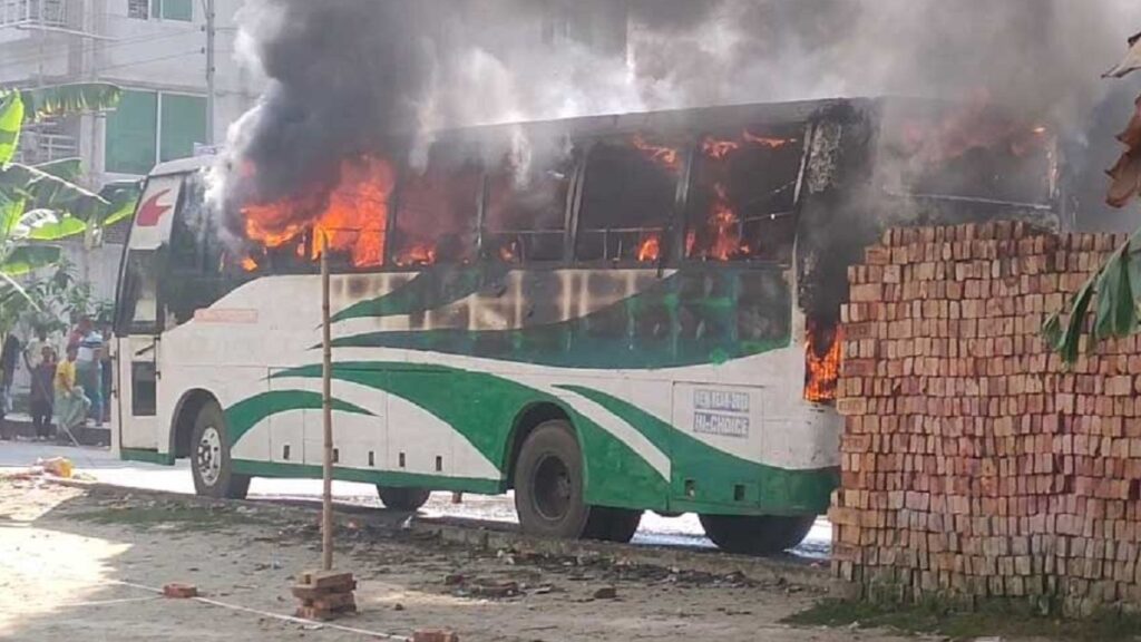 গাজীপুর মহানগরীর শহীদ বরকত সরণি এলাকায় থেমে থাকা দুরপাল্লার একটি বাসে আগুন দিয়েছে দুর্বৃত্তরা। রোববার (১৯ নভেম্বর) দুপুরে ওই এলাকার শিববাড়ি-জয়দেবপুর সড়কে এ ঘটনা ঘটে। দুর্বৃত্তের দেয়া আগুনে একমাত্র আয়ের অবলম্বন বাসটি পুড়ে যাওয়ায় মালিক দেলোয়ার হোসেন দেলু ঘটনাস্থলেই জ্ঞান হারিয়ে ফেলেন। পরে স্থানীয়রা তাকে হাসপাতালে ভর্তি করেন।
