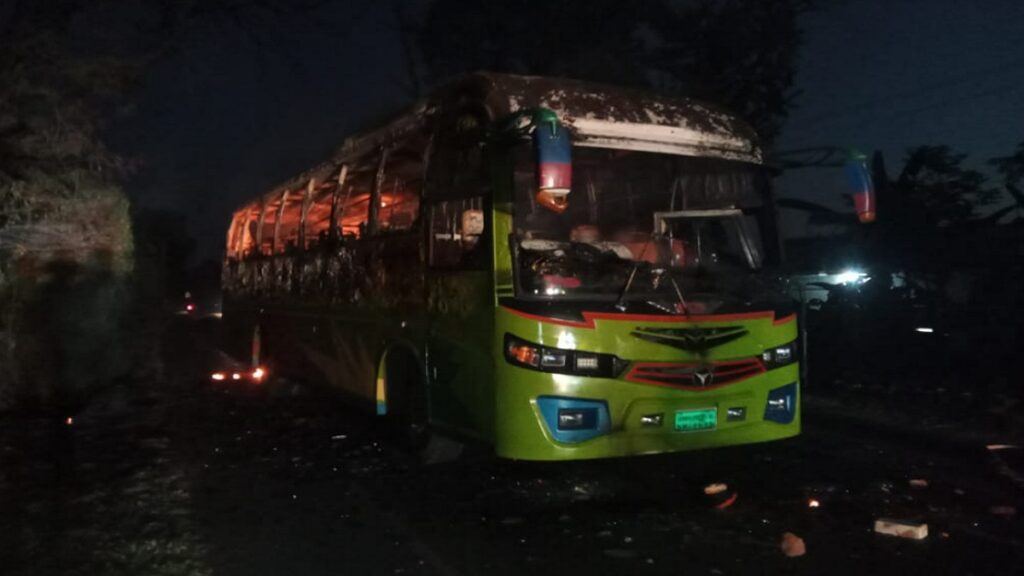 রোববার (১৯ নভেম্বর) রাজশাহীর গোদাগাড়ী উদপুর এলাকায় রাজশাহী-চাঁপাইনবাবগঞ্জ মহাসড়কে ওই বাসে অগ্নিসংযোগ ঘটানো হয়।