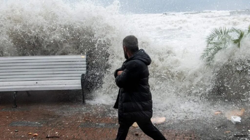 রাশিয়ার ব্ল্যাক সি বন্দরে বড় বড় ঢেউ শহরের সমুদ্রসীমায় আছড়ে পড়ছে। ছবি: বিবিসি।