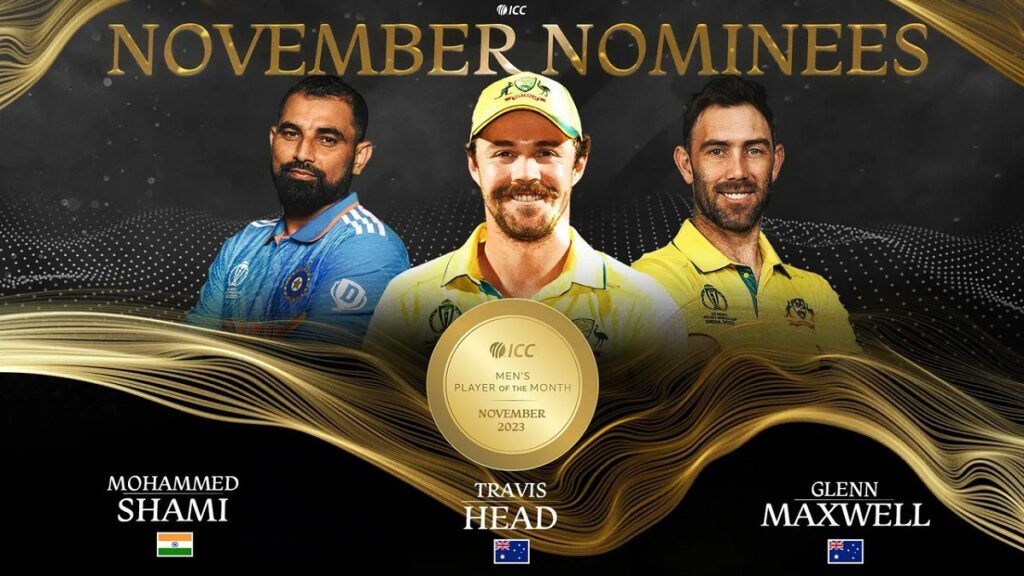 নভেম্বর মাসের সেরা খেলোয়াড়ের সংক্ষিপ্ত তালিকা প্রকাশ করেছে বিশ্ব ক্রিকেটের সর্বোচ্চ নিয়ন্তা সংস্থা-আইসিসি। অস্ট্রেলিয়া দলের দুই খেলোয়াড় ট্রাভিস হেড ও গ্লেন ম্যাক্সওয়েল আছেন এই তালিকায়। এছাড়াও ভারতীয় দল থেকে নির্বাচিত হয়েছেন পেসার মোহাম্মদ শামি।