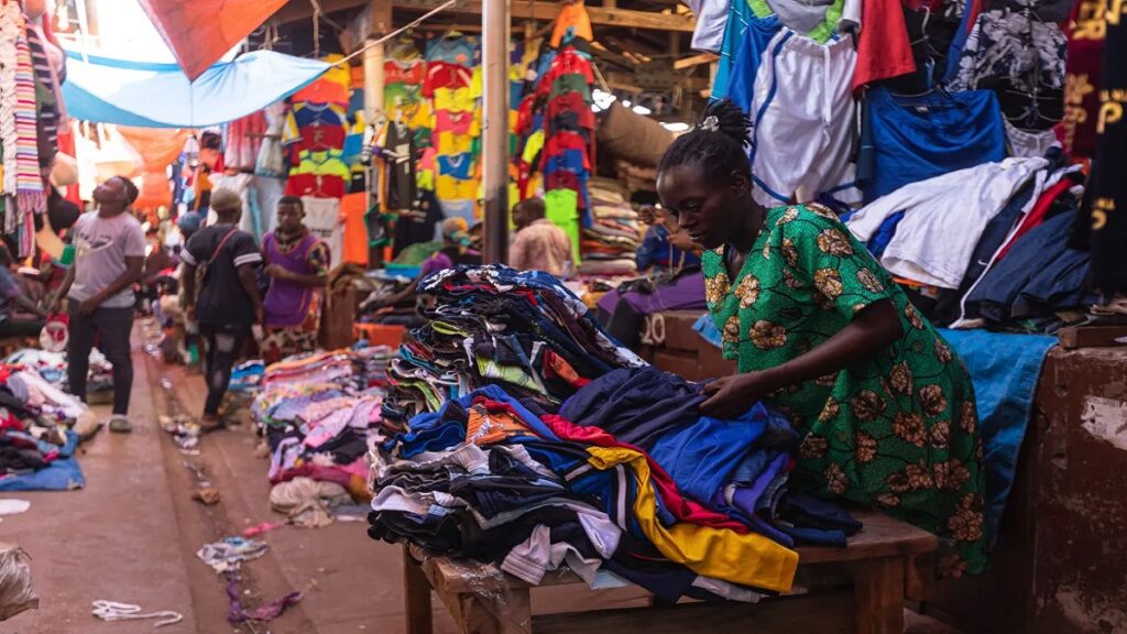 কাম্পালার বৃহত্তম সেকেন্ডহ্যান্ড কাপড়ের বাজার ওউইনোতে গ্রাহকদের জন্য অপেক্ষা করছেন একজন নারী বিক্রেতা। ছবি: আল জাজিরা।